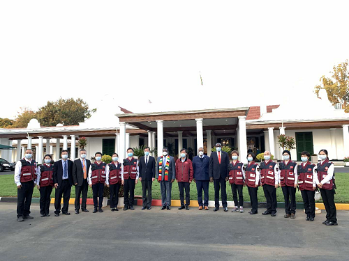 下午,我们接到临时通知,将受到津巴布韦最高元首总统的接见。这可是我第一次参加外事活动,而第一次就是国家级的会见,确实让人有点激动。在进入总统府的过程中,我们再次感受到了津巴布韦抗疫工作的细致。在进入第一道大门时,有一位彬彬有礼的工作人员,上车为我们每个人测量体温,并进行手消。而在后面进入安检门时,也还有手消的一道过程。会议是在一个临时搭建的大帐篷式的会议中心进行,据工作人员介绍,正是因为新冠的发生,当地政府在户外场地搭建了这个通风良好的帐篷作为特别时期的会议中心。可见津巴布韦的政府整体的抗疫方案是非常严谨的在实施的。整个会议中心布置简单大方,我们就坐在用桌子拼成的一个方形会议席上。整个会议在一种祥和的氛围下进行,整个津巴布韦的高层官员都参加了这次会见,会上总统对医疗队的到来表示了欢迎,也对中国一直以来在抗疫过程中给与津方的支持表示感谢。希望通过这次专家团队的来访能加深中津在抗疫方面的合作,并帮助津巴布韦改进在防控治疗方面的工作。总统的接见极大的鼓舞了我们大家的士气,大家都感受到津巴布韦的真诚与热情相,也对接下来两周的工作充满了期待,相信在我们的共同努力下,津巴布韦一定能战胜疫情。