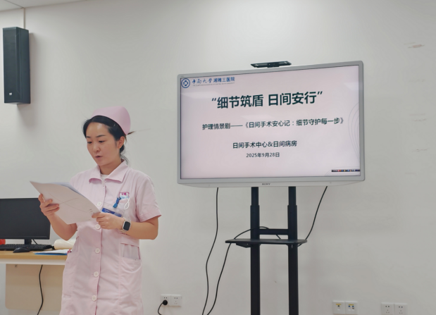 9月28日下午,中南大学湘雅三医院日间手术中心&日间病房举办科室首次护理实习生主题情景教学活动。本次活动以“细节筑盾,日间安行”为主题,通过情景剧演绎、互动分享与专家点评等形式展现,特别邀请病友及家属参与。日间手术中心护士长伍美容、副护士长罗佩佩以及各位带教老师共同参与指导,活动由日间手术中心总带教甘露主持。