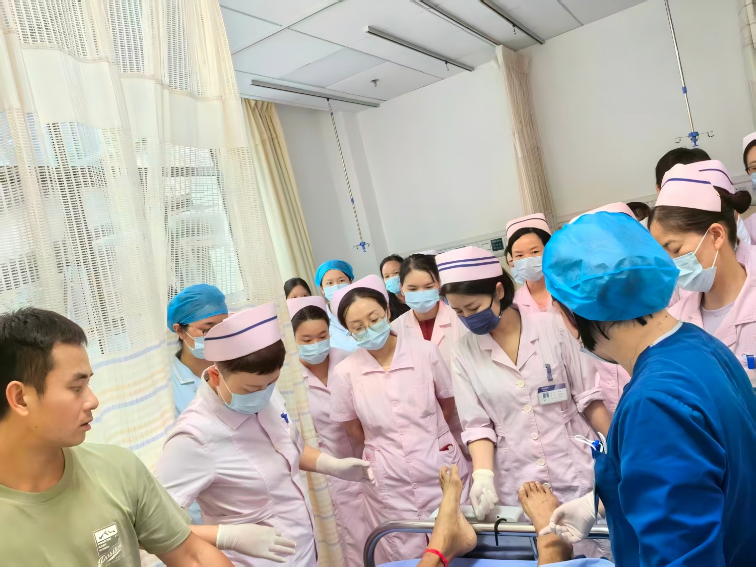 10月17日下午,感染科病区组织了一场深入病房的跨学科护理会诊。针对一位病情复杂、诊断尚不明确的发热重症患者,其集多重感染、神经功能受损与营养衰竭等多系统问题于一身,且治疗矛盾突出,科室特邀请卒中、康复医学、伤口造口、肺康复、VTE防治、膳食营养、糖尿病及护理感控等多个专业小组的护理人员齐聚床旁,共同为患者把脉问诊,制定了一套集治疗、康复、预防及人文关怀于一体的个性化精准护理方案。会诊由感染科病区护士长李秋艳主持。