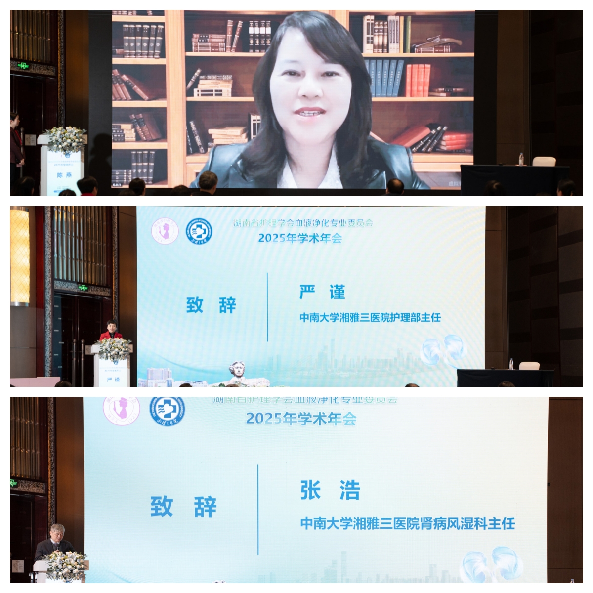 陈燕理事长通过视频致辞。她指出,血液净化护理是守护慢性肾脏病患者生命健康的重要防线,是护理学科中极具专业性、技术性与人文温度的重要分支。近年来,我省血液净化护理事业在专委会的引领下,实现了跨越式发展;希望专委会继续发挥引领作用,搭建更高质量的学术平台、培训平台、协作平台,为广大肾脏病患者筑起坚实的健康屏障。严谨介绍了湘雅三医院护理学科的特色与优势,医院作为湖南省护理学会血液净化专委会主委单位,通过学术会议、基层帮扶指导等形式,致力于引领全省血液净化护理工作规范发展。也期待全体学员珍惜此机会,深入交流,共享智慧,满载而归,将所学所感传递给更多的医务工作者,将所知所获造福于更多的血透患者。张浩教授指出血液净化技术是现代医学治疗终末期肾病及多种危重症的重要手段。血液净化护理人员的专业素养、敬业精神和人文关怀,直接关系到患者的透析质量、生存预后乃至整个血液净化事业的蓬勃发展。他激励大家通过学术会议将新知识、新理念和新技术带回去更好地服务广大的基层肾脏病患者,能更好地增进医院之间的友谊与合作。