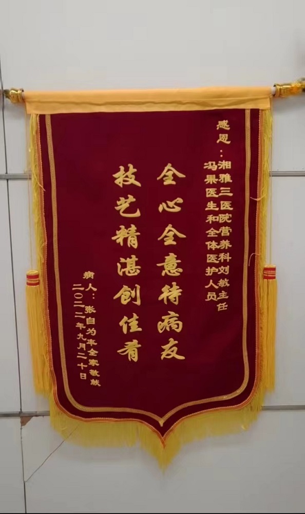 我们全家非常感谢中南大学湘雅三医院营养科刘敏主任和冯果医生的指导,他们润物细无声的营养治疗让老张活的有质量、有保障,并且老张好几次进ICU都能否极泰来,与他们精细的营养治疗有密不可分的关系,所以特制此锦旗,聊表谢意。