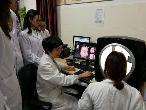 同学们对美容中心各类先进皮肤激光美容设备、各类皮肤美容和改善的治疗方法表现出浓厚的兴趣。在老师的引导下,同学们结合“所见”与“所学”进行现场提问与讨论,部分同学还初体验了皮肤检测和激光脱毛、激光祛痣等治疗项目,学习热情高涨。
