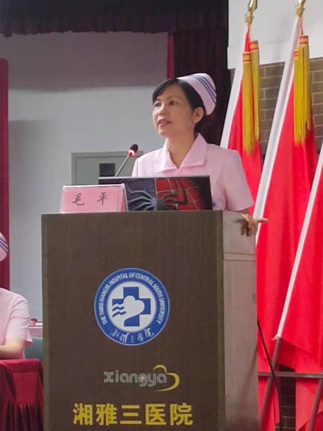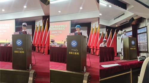 中心ICU何志萍代表重症监护系统护士长讲话。她指出,重症团队就像一支最精锐的特种部队,牢牢筑起了拯救危重患者的最后一道生死防线,ICU护士需要具备过硬的专业素质、职业素质、身体素质,希望全体学员勤学苦练、珍惜实习阶段,注重培养临床护理思维,锻炼身体,强健体魄。呼吸治疗师兼肺康复师向飞结合自身实习与重症监护病房工作的经历,从1名懵懂护生成长为独当一面的抗疫重症专科护士,他建议学员时刻保持正能量,多与优秀的人沟通学习。益阳医专张紫阳代表全体学员表示,会保持高涨的热情,不忘初心,砥砺前行,不辜负领导和老师们的谆谆教诲和期望,努力成长为优秀的重症实习专科护生。