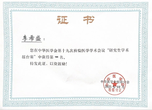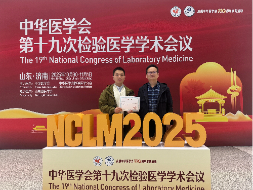 10月30日至11月1日,由中华医学会、中华医学会检验医学分会主办、山东省医学会承办的中华医学会第十九次全国检验医学学术会议在济南山东国际会展中心召开。此次会议是中国检验医学领域的盛会,内容涵盖临床检验和实验室管理各领域最新的研究成果和发展趋势,并对检验医学所面临的新形势和新挑战进行广泛充分的交流探讨。中南大学湘雅三医院2022级博士研究生李希盛在医院聂新民教授和罗秀菊教授共同指导下获得研究生学术擂台赛第一名。