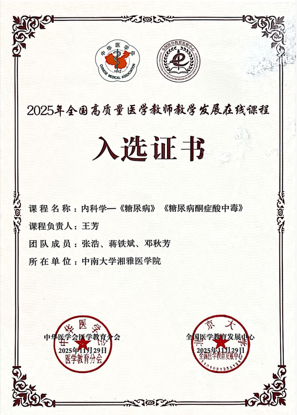 11月29日至30日,中华医学会医学教育分会2025年度全体委员会议暨学术年会在山东青岛召开,会上进行了“2025年全国高质量医学教师教学发展在线课程”颁奖仪式。由中南大学湘雅三医院作为课程申报单位,湘雅医学院作为统筹推荐单位,中南大学湘雅三医院内分泌科王芳老师担任课程负责人,内科教研室主任张浩、副主任蒋铁斌指导,邓秋芳等青年教师组成的教学团队所申报的课程《内科学——〈糖尿病〉〈糖尿病酮症酸中毒〉》成功入选。该课程是湘雅三医院首门入选课程,也是中南大学医学口唯一一门入选课程。