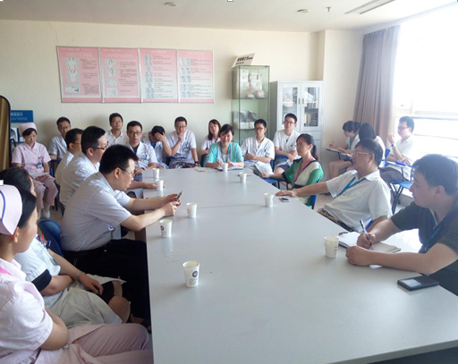 在普外二科、骨科、神经内科以及血液内科的示教室,黄进华副院长一行率先听取了普外二科李小荣主任、骨科王剑龙副主任,神经内科侯德仁教授、血液内科刘竞主任的反馈,调研住院医师和研究生在病房轮训期间的实际管床数和病种数、实施技能操作的种类和数目、外科手术参与程度、科室专门针对住院医师的小讲课、疑难病例讨论会、教学查房等相关教学活动的执行情况、手术视频网络信息平台的使用情况。