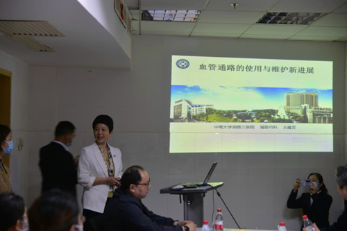 二党支部副书记王露芳主管护师分享了《血管通路的使用维护与新进展》,讲述了科室作为湖南省血管通路学组主委单位在透析病人血管通路方面的新进展及学科优势。
