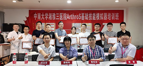 7月24日-25日,由中南大学湘雅三医院骨科和临床技能训练中心联合举办的“关节镜培训班(第7期)暨2021年ArthroS基础技能模拟器培训班”在外科楼14楼顺利召开。本次培训班严格限制招生规模,采取小班制、1对1手把手教学模式,吸引了湖南航天医院、长沙市第八医院、长沙县中医院、溆浦县中医院等多位运动医学-关节镜专科方向医师与会。培训由骨科主任吴松教授、临床技能中心主任唐晓鸿教授,以及5位资深关节镜导师联合授课,学员在融会理论知识的基础上,采取在虚拟现实模拟器上训练的刻意练习模式。