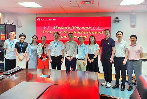 6月27日下午,美国耶鲁大学伦理学专家Kaveh Knoshnood教授来访中南大学湘雅三医院。医院党委书记何庆南在外科楼19楼会议室亲切会见来宾,国际合作与交流办牵头组织了主题为“国际多中心科学研究的伦理要素”的学术交流专场讨论会。医院伦理委员会副主任委员袁洪教授,伦理委员会办公室、研究生部、教务部、科研部、护理部等相关职能部门主任和副主任,以及项目PI代表、伦理委员会委员、教研室老师代表、研究生代表等40余人参会。交流会由国合办主任刘新春主持。