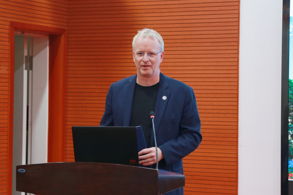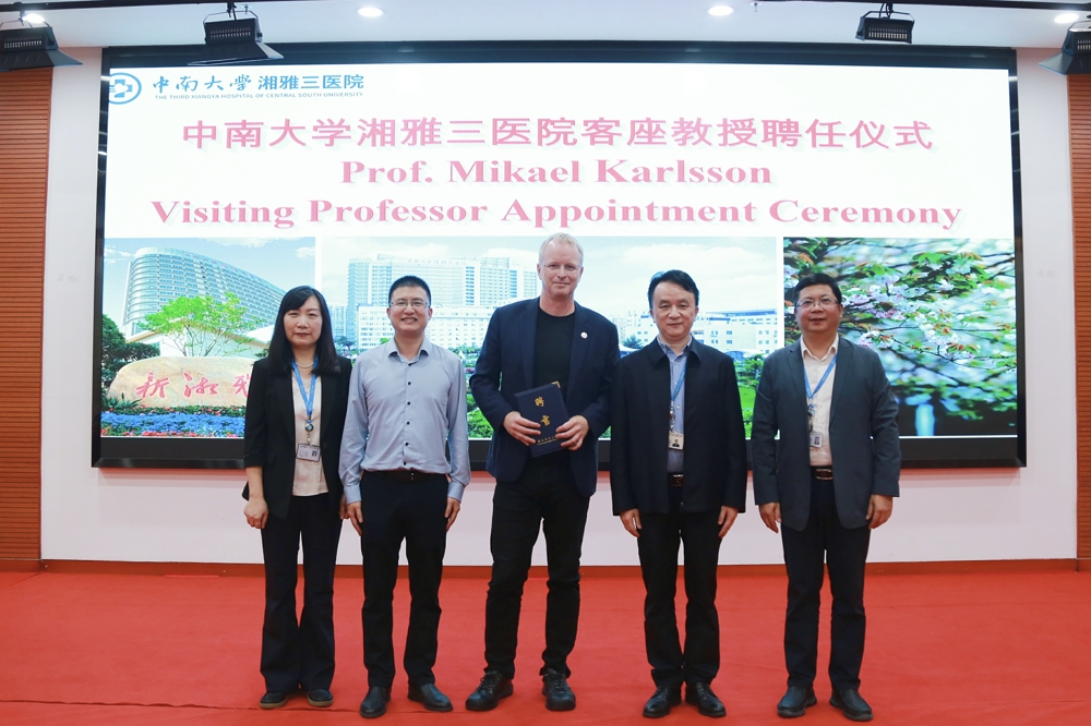 何庆南致辞并为Mikael Karlsson颁发客座教授聘书、佩戴院徽。他表示,此次湘雅三医院与世界顶尖生命科学研究中心及知名海外教授强强联合,对提高医院科学研究的深度与广度有重要意义。吕奔课题组已与其开展了一系列深入合作,将能够更好地提升医院相关基础研究方面的综合实力。这次引进Mikael Karlsson作为湘雅三医院客座教授,将推动开展更大范围、更宽领域、更深层次、更高质量的医学国际合作交流,对不断提升新湘雅国际影响力有重要的意义与深远的影响。