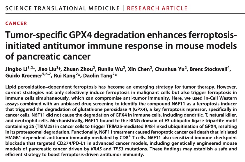 近日,湘雅三医院消化内科李静泊青年医师,在Science子刊《Science Translational Medicine》(《科学转化医学》,中国科学院1区期刊,IF = 17.1)以论著形式线上发表题为“Tumor-specific GPX4 degradation enhances ferroptosis-initiated antitumor immune response in mouse models of pancreatic cancer”(胰腺癌小鼠模型中肿瘤特异性GPX4降解增强铁死亡触发的抗肿瘤免疫反应)的原创性研究论文,湘雅三医院李静泊医师为该论文共同第一作者,中南大学湘雅三医院为论文第一单位。