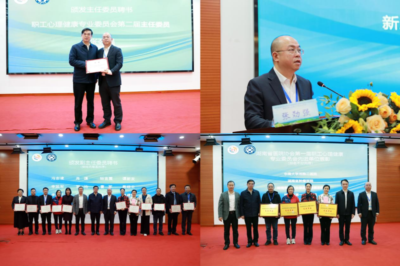 湖南省医院协会会长陈卫红为新当选的专委会主任委员张劲强颁发聘书。张劲强在就职表态中提出:一是进一步坚持政治引领,强调服务导向,始终把“推进全省医疗卫生机构职工心理健康体系建设,提高各级医院职工心理健康服务水平”作为工作出发点、落脚点,助力建设一批心理健康服务示范单位,促进职工心理健康事业高质量发展;二是进一步坚持专业为本,强调创新为要,持续加强自身建设,加强对职工心理服务人才队伍建设与培养,促进职工心理健康服务规范发展;三是进一步坚持见行见效,强调合作共赢,充分发挥桥梁纽带作用,优化整合资源,搭建共享平台,完善职工心理关爱工作专家库建设,提升服务的便捷性和实效性。