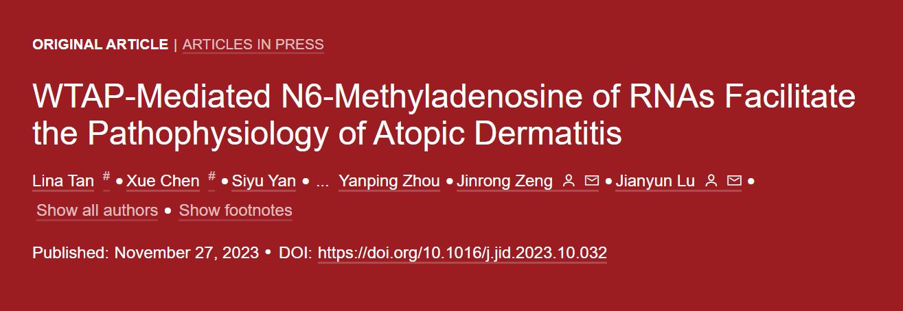 11月27日,中南大学湘雅三医院皮肤科鲁建云、谭丽娜、曾金容团队在Journal of Investigative Dermatology(JCR 1区,IF=6.5)发表了题为“WTAP-Mediated N6-Methyladenosine of RNAs Facilitate the Pathophysiology of Atopic Dermatitis(WTAP介导RNAs的m6A修饰促进特应性皮炎的病理生理改变)”的研究成果。研究报道了WTAP介导的m6A修饰在特应性皮炎发病机制中的重要作用。