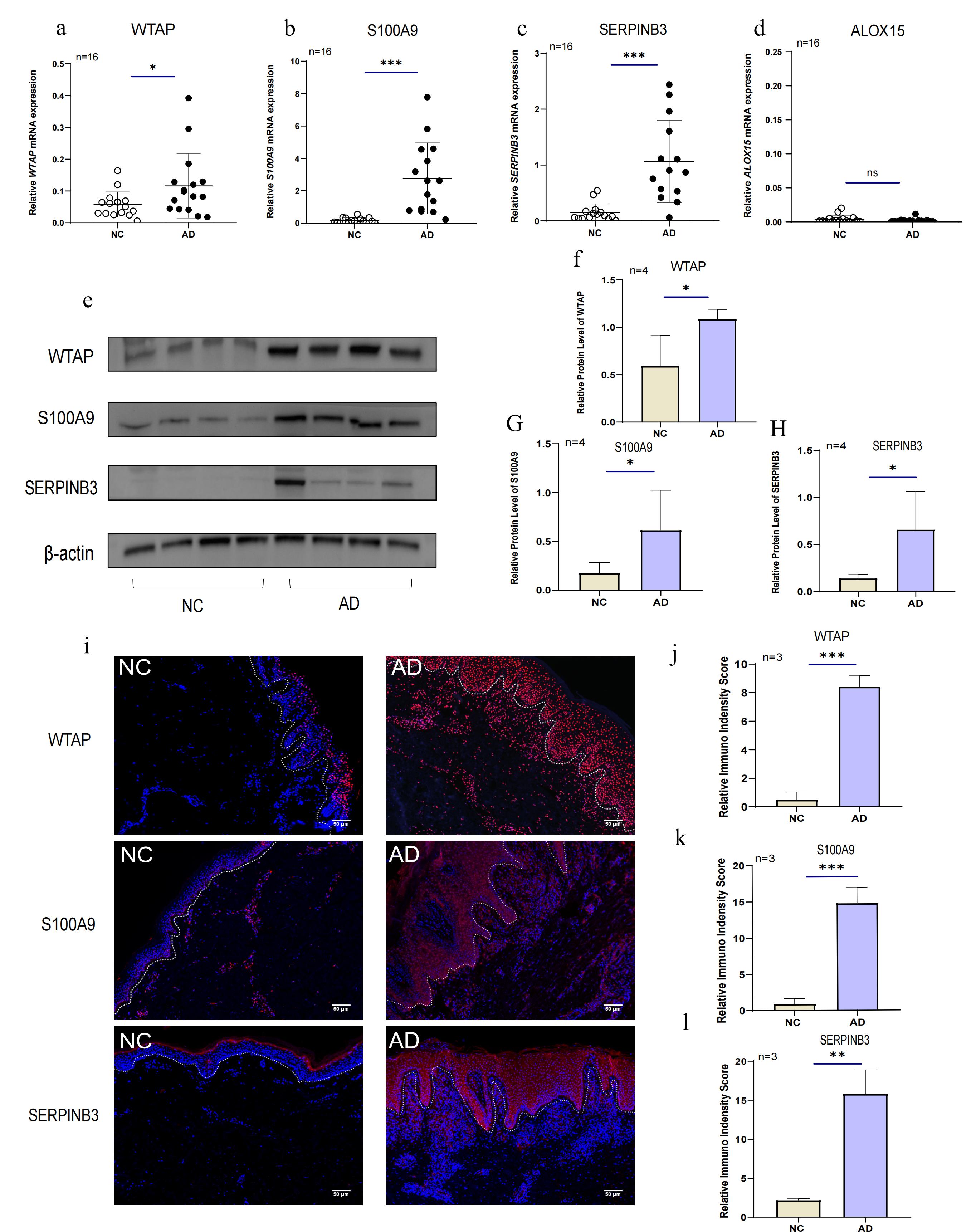 在该研究中,通过使用Arraystar m6A-mRNA转录组芯片筛选出特应性皮炎患者皮损中的差异性表达基因及其m6A水平差异,以及m6A修饰相关酶。证实了m6A甲基转移酶WTAP和两个候选差异基因(S100A9和SERPINB3)在和特应性皮炎患者皮损表皮的角质形成细胞中显著上调。体外细胞实验证实,WTAP调控S100A9和SERPINB3的表达,并促进原代人表皮角质形成细胞增殖,抑制其分化。此外,还发现WTAP、S100A9和SERPINB3的表达与特应性皮炎的严重程度密切相关。这一全新的研究成果为特应性皮炎的诊断和治疗提供了新的见解。