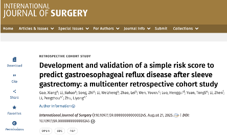 中南大学湘雅三医院胃肠外科Ⅱ科(机器人及减重代谢外科)朱晒红、朱利勇教授团队牵头的多中心协作研究在国际权威期刊International Journal of Surgery(国际外科学杂志,JCR1区,10.1分)发表题为《Development and validation of a simple risk score to predict gastroesophageal reflux disease after sleeve gastrectomy: A multicenter retrospective cohort study》(预测袖状胃切除术后胃食管反流病的风险评分的开发和验证:一项多中心回顾性队列研究)的最新成果。其中朱利勇教授、李鹏洲副教授为论文通讯作者,论文第一作者为高祥博士、李嘉豪硕士,中南大学湘雅三医院为该项研究成果的第一完成单位及通讯作者单位。