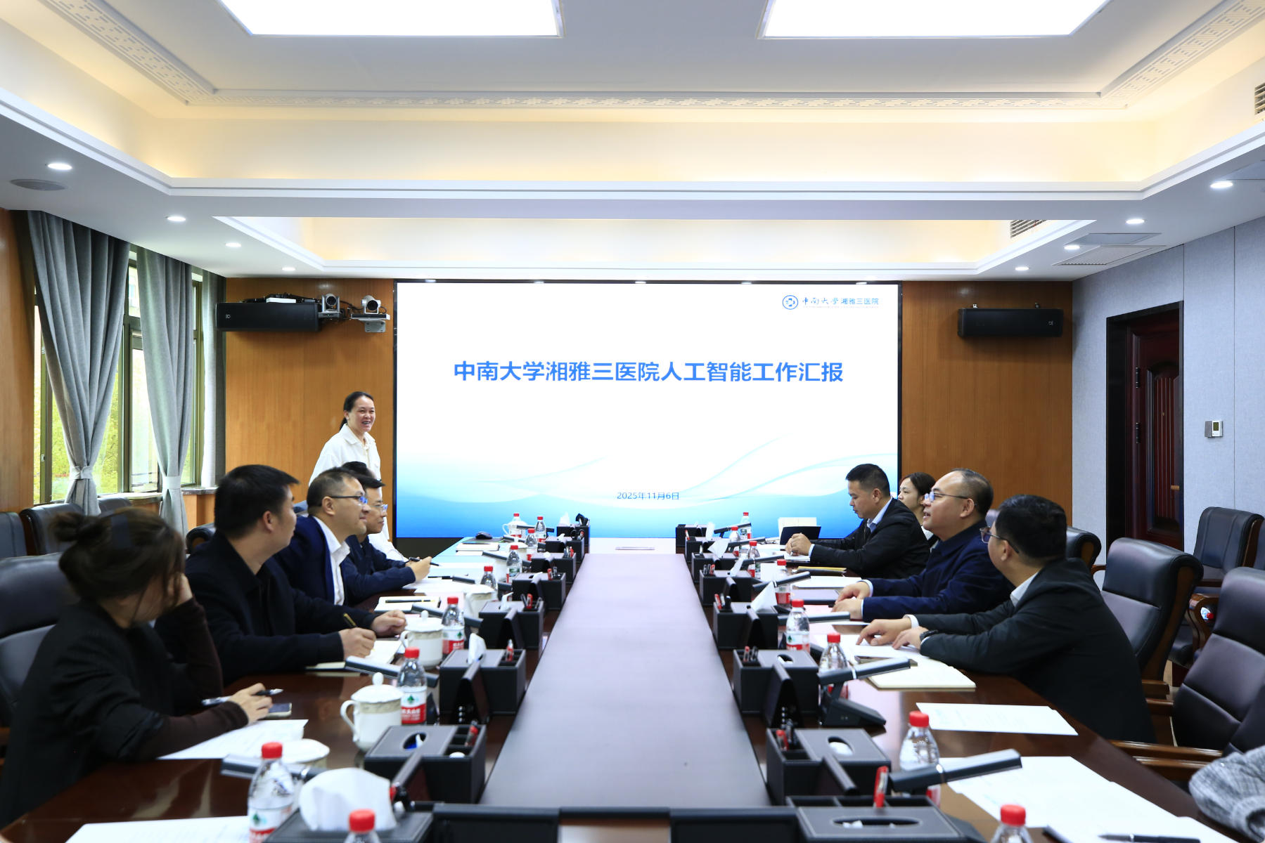 2025年11月6日上午,湖南省工业和信息化厅在中南大学湘雅三医院召开“医院人工智能工作调研座谈会”。省工信厅电子信息处处长刘平带队,联合湖南大学、省数字经济促进会、省传感器产业促进会、省医疗器械行业协会及多家人工智能科技企业代表参与调研。中南大学湘雅三医院院长江泓、党委副书记杨飞龙出席会议,医学信息研究中心主任王安莉等相关部门负责人参加。