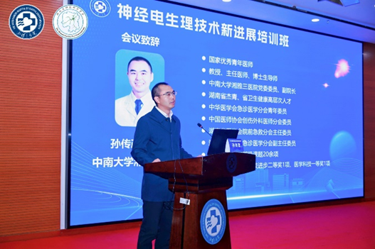 开幕式上,湘雅三医院副院长孙传政代表医院致欢迎辞。他回顾了医院近年来的重点发展成就,特别介绍了神经内科在临床医疗、科研创新与人才培养等方面取得的显著进步,并希望以此次培训为契机,进一步深化区域学术交流、凝聚学科共识,共同探索神经电生理技术的创新与应用路径。