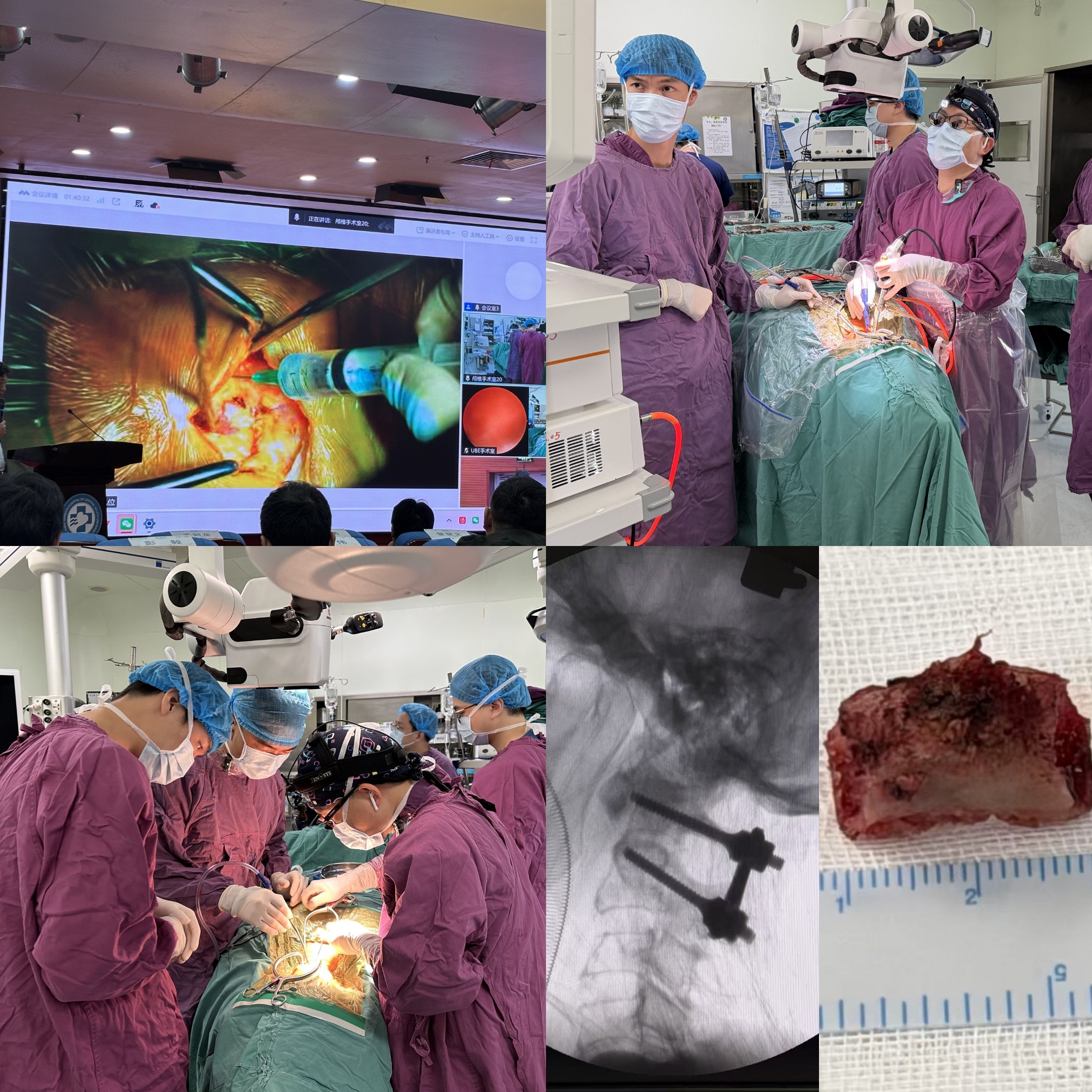 会议首场演示聚焦当前热门的单边双通道内镜技术(UBE)。在王剑龙教授主持下,谭伟主治医师首先对一例腰椎间盘突出症病例进行了全景式汇报。随后,苗惊雷教授团队从容不迫地展开了从精准定位到镜下精细操作的全流程演示,并展示了UBE镜下椎间盘纤维缝合技术。直播画面中,每一个解剖层次的分离、每一处神经的规避都清晰可见。围绕手术适应症、操作技巧与并发症防治,线上线下提问不断,实操细节在互动中得以深度剖析与共识凝聚。