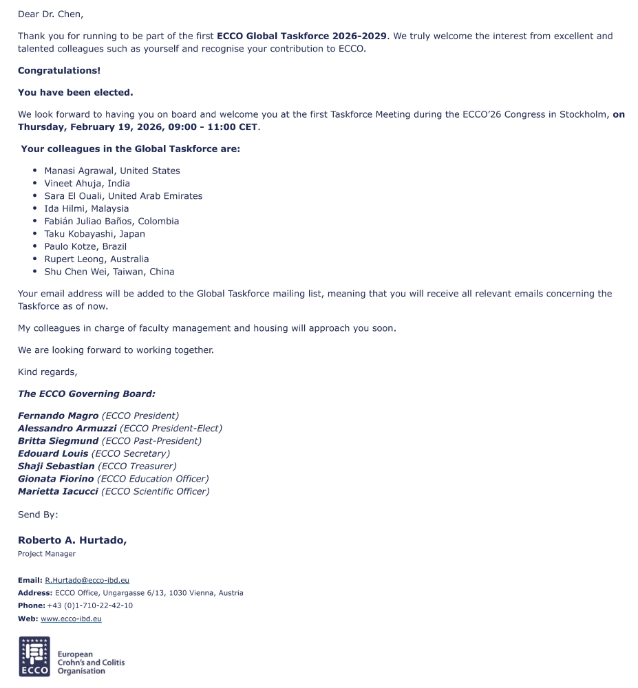 作为ECCO委员会成员单位,王晓艳教授/陈杰副教授团队将深度参与全球炎症性肠病领域临床及科研工作。通过这一平台,其将有望促进诊疗标准与创新资源的国际公平共享,并在全球舞台上系统性地展示我国及亚洲地区在在该领域的科研成果与临床经验。