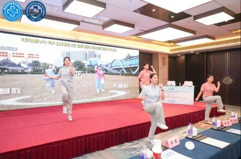 中场迎来“唤醒操”表演,在五位年轻活力的研究生和实习生的带领下,参会学员一齐做中南大学湘雅三医院临床营养科“4分钟减重操”。