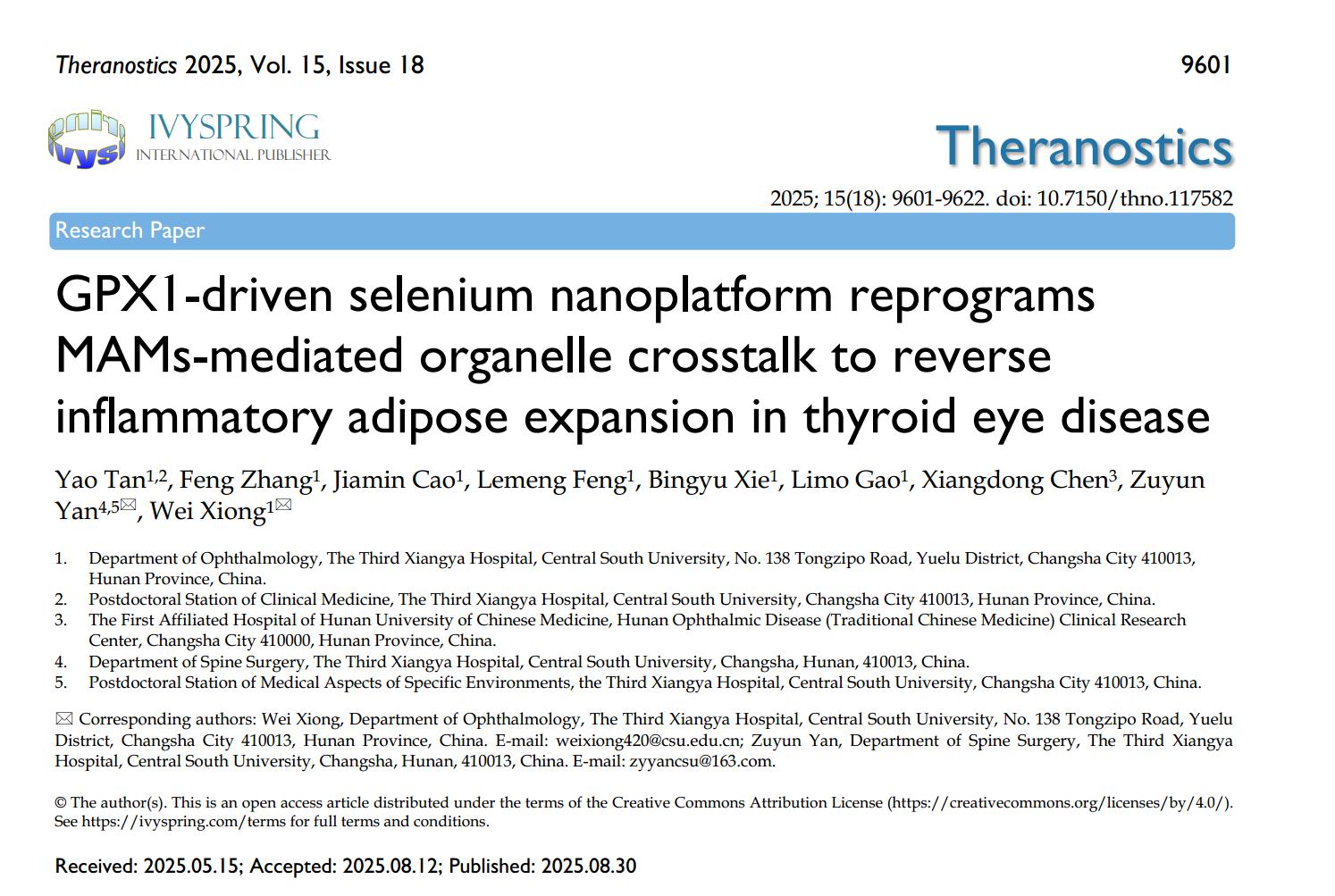 中南大学湘雅三医院眼科熊炜主任医师团队围绕甲状腺眼病(Thyroid Eye Disease,TED)的发病机制与精准靶向诊疗持续攻关,2025年度该团队发表论文19篇(其中JCR一区论文14篇,总IF值>80),获国家发明专利3项。