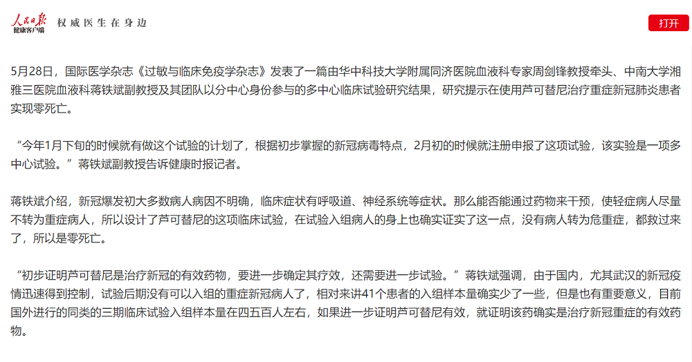 5月28日,国际医学杂志《过敏与临床免疫学杂志》发表了一篇由华中科技大学附属同济医院血液科专家周剑锋教授牵头、中南大学湘雅三医院血液科蒋铁斌副教授及其团队以分中心身份参与的多中心临床试验研究结果,研究提示在使用芦可替尼治疗重症新冠肺炎患者实现零死亡。"今年1月下旬的时候就有做这个试验的计划了,根据初步掌握的新冠病毒特点,2月初的时候就注册申报了这项试验,该实验是-项多中心试验。"蒋铁斌副教授告诉健康时报记者。蒋铁斌介绍,新冠爆发初大多数病人病因不明确,临床症状有呼吸道、神经系统等症状。那么能否能通过药物来干预,使轻症病人尽量不转为重症病人,所以设计了芦可替尼的这项临床试验,在试验入组病人的身上也确实证实了这一点,没有病人转为危重症,都救过来了,所以是零死亡。"初步证明芦可替尼是治疗新冠的有效药物,要进一步确定其疗效, 还需要进步试验。”蒋铁斌强调,由于国内,尤其武汉的新冠疫情迅速得到控制,试验后期没有可以入组的重症新冠病人了,相对来讲41个患者的入组样本量确实少了一些,但是也有重要意义,目前国外进行的同类的三期临床试验入组样本量在四五百人左右,如果进一步证明芦可替尼有效,就证明该药确实是治疗新冠重症的有效药物。