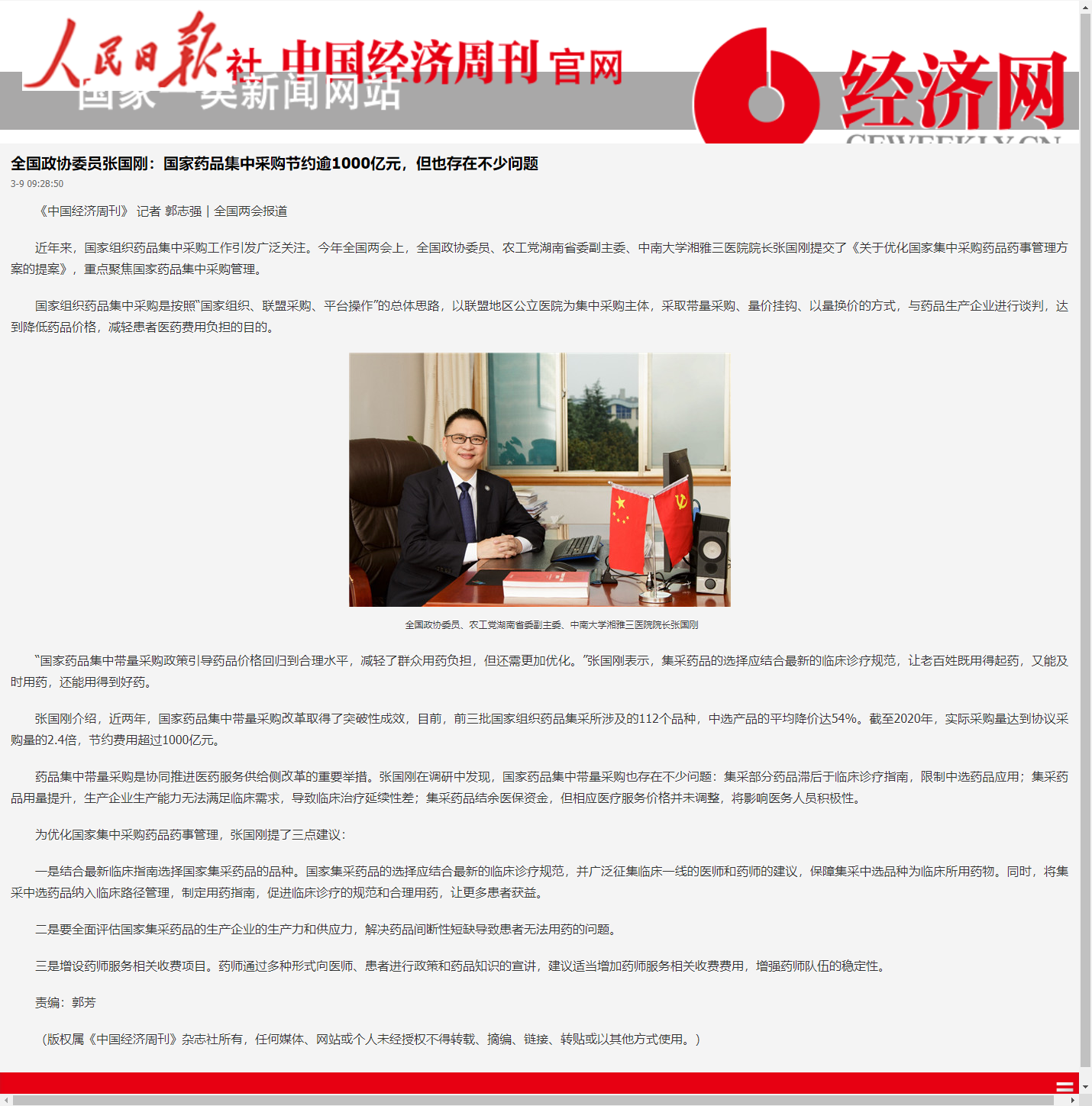近年来,国家组织药品集中采购工作引发广泛关注。今年全国两会上,全国政协委员、农工党湖南省委副主委、中南大学湘雅三医院院长张国刚提交了《关于优化国家集中采购药品药事管理方案的提案》,重点聚焦国家药品集中采购管理。