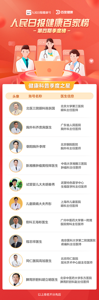 人民日报健康百家榜第四期季度榜,根据人民日报健康号、百家号双平台了个月综合运营数据,结合专业度、科普性、作者权威性、活跃度、互动量等维度,从双平台万名号主中评选出健康科普优秀机构、健康科普季度之星、季度公益影响力直播医生三个榜,