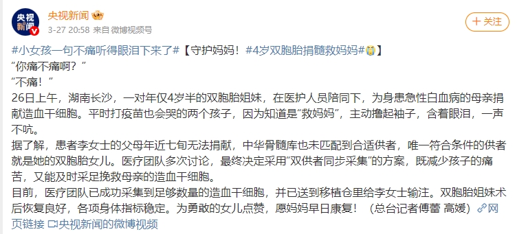[上一篇] 央视新闻:四岁双胞胎姐妹携手捐献造血干细...