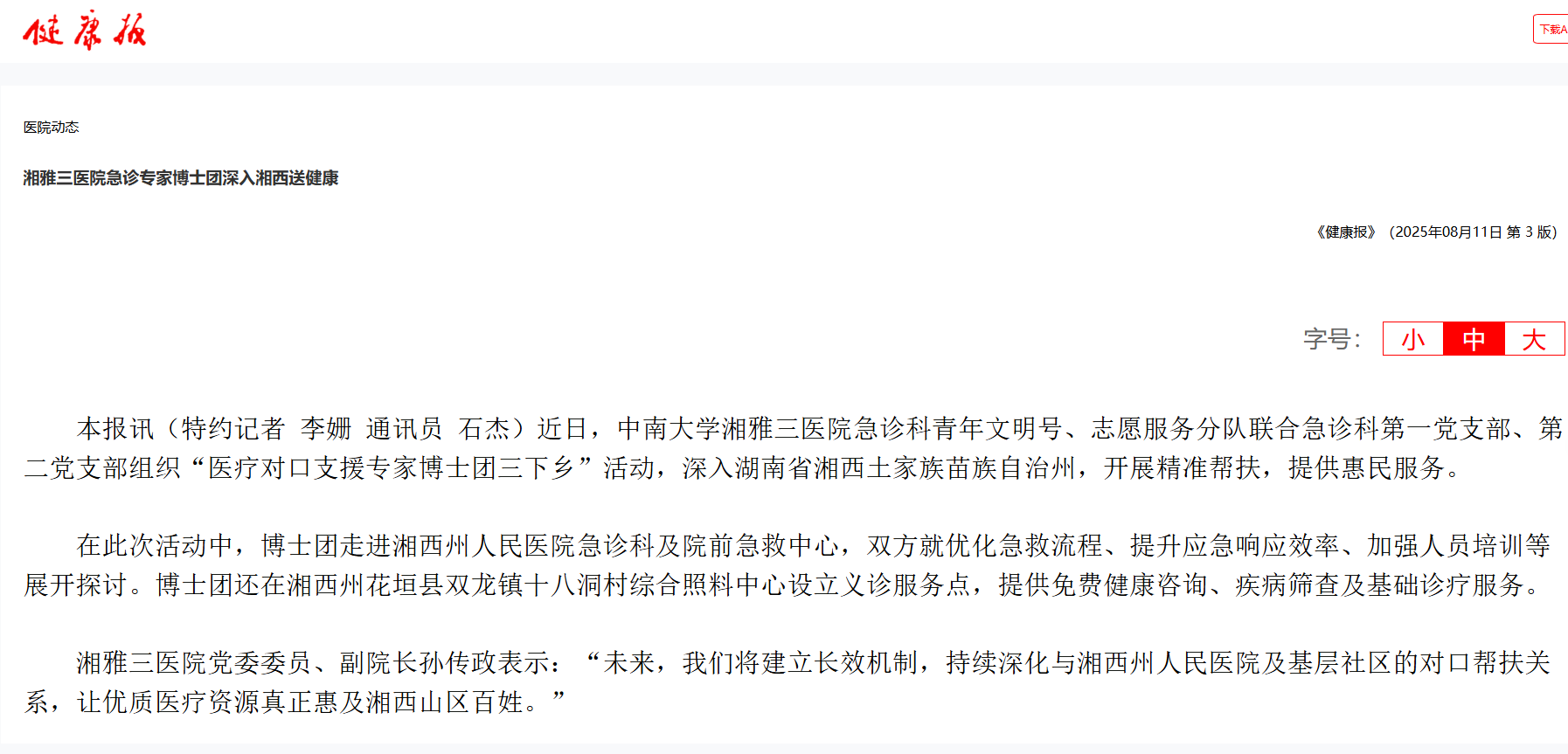 人民网 | 新华网 | 中华人民共和国国家卫生健康委员会 | 中华人民共和国教育部 | 湖南省政府 | 红网 | 湖南省卫生健康委员会 | 湖南省教育厅 | 中南大学 | 湘雅医学院 | 湘雅医院 | 湘雅二医院 | 协和医院 | 华西医院 | 西京医院 | 瑞金医院 | 复旦中山医院 | 武汉同济医院 | 中山医院