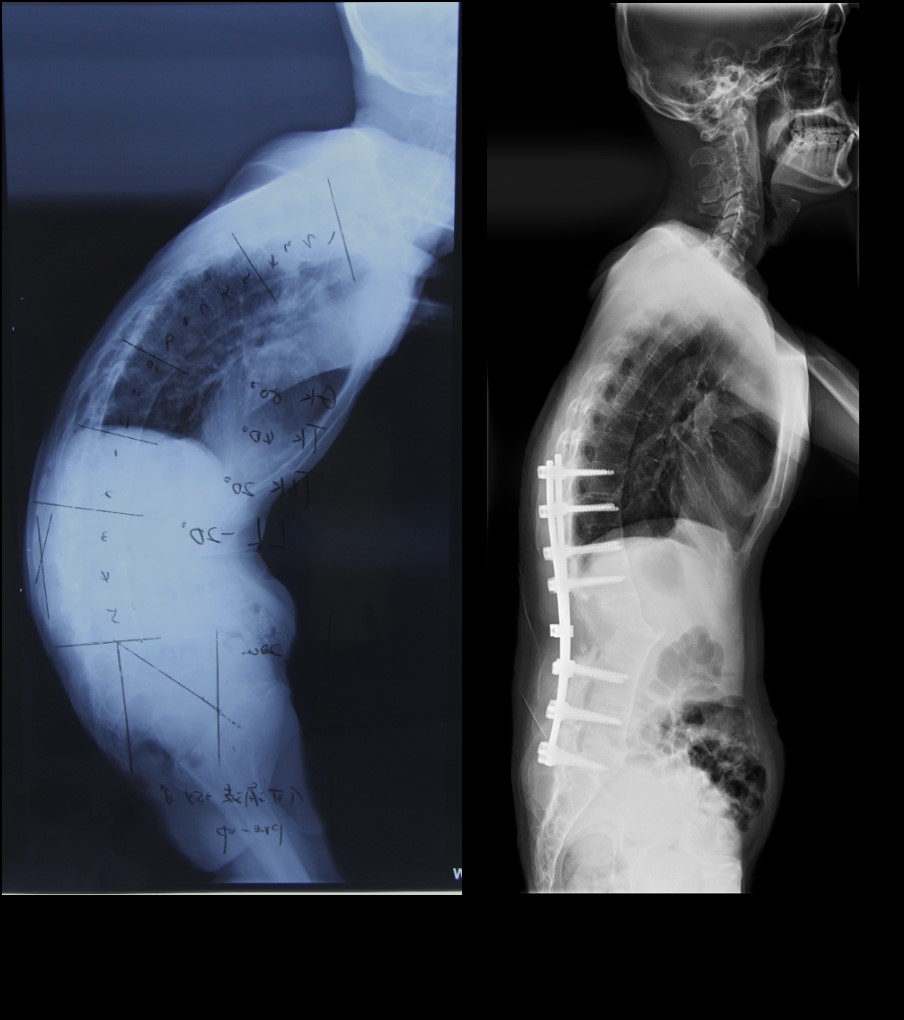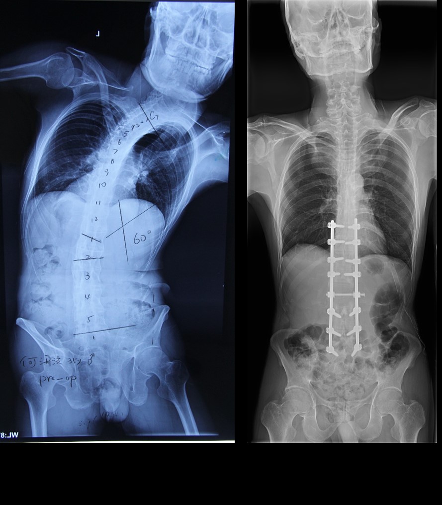 最终,湘雅三医院脊柱团队克服重重困难,顶住压力,采用了风险更大的矫形方案,选择在腰1、2节段行非对称的“V”形截骨。在华翔增量工程师制作的3D打印截骨导板帮助下,手术医生精确定位截骨椎体,截骨角度和深度和术前模拟完全吻合,整个截骨过程一气呵成。术前扭曲得像棵“歪脖子树”的何先生,术后第三天重新挺直了腰杆,在病房昂首阔步,引得病友们啧啧称奇。