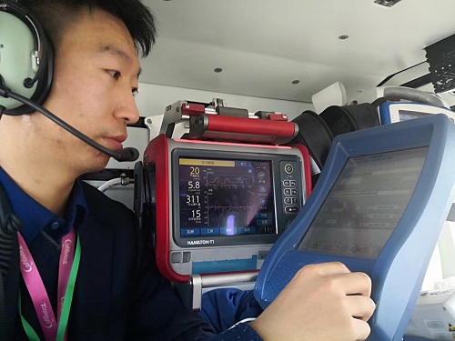 刘作良副主任立即启动了B计划——空中救援。原本派去的救护车地面跟随,进行道路指引和地面安全保障。10月27日15点20分,装载着病人和各种救命仪器设备的直升飞机从怀化起飞。然而飞运途中,患者血氧饱和度下降心率增快,ECMO团队赵尚平医师当机立断将氧浓度打到100%,调整PEEP到12。由于ECMO和呼吸机同时运转,且氧气浓度100%维持,氧气瓶压力显示只剩20%。距离长沙还有1个小时的行程,与地面工作人员取得联系后,16点48分,紧急降落娄底市第一人民医院进行中途补给。