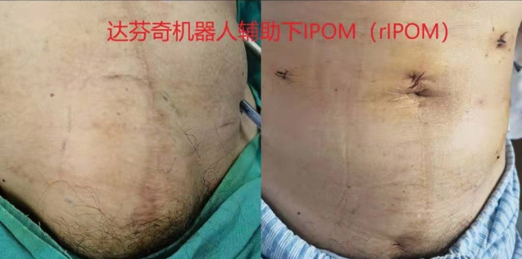 据悉,刘先生4年前行开放直肠癌根治术后出现前腹壁正中切口疝(切口长度15cm,腹壁缺损10cm),多处求医未果;李先生自3年前于外伤清创缝合术后,发生腹壁切口疝(腹壁多处缺损,最大为6cm),始终没有治愈。在湘雅三医院胃肠外科II科,经过朱利勇主任、李鹏洲副主任医师、宋智主治医师团队细致的术前评估后,决定为李先生实施腹壁切口疝机器人辅助下TAPP手术,为刘先生行IPOM手术。手术顺利,两位患者均术后第1天下床,第2天即出院。
