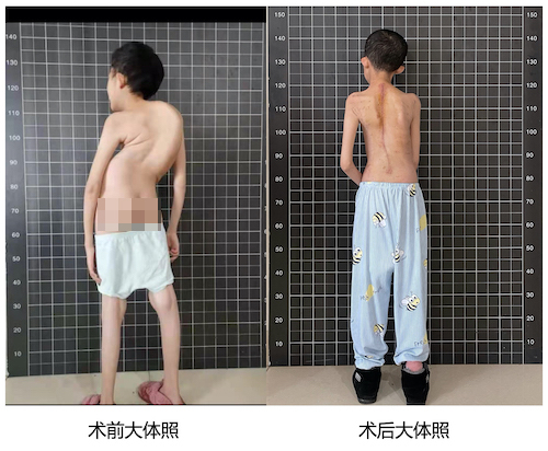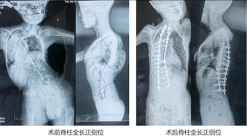 经过多学科会诊和脊柱外科全体专家讨论后,制定了详尽而周密的治疗计划。首先对患儿实施颅骨环重力悬吊牵引,部分矫正患儿侧弯角度,降低手术难度,改善通气功能,增加矫形手术耐受能力。经过3个月的大重量牵引,胸椎主弯角度由120°降低至75°,同时通气功能明显改善,具备了矫形手术条件。2021年3月10日,由邓幼文教授、周勇副教授,王正光主治医师、谭伟总住院医师组成的手术医师团队,为小欣实施了脊柱侧弯后路矫形手术。手术耗时11小时34分,术中失血约1600ml。术后生命体征平稳,未出现任何手术相关并发症。术后脊柱序列恢复较满意,身高增高了12公分,已顺利出院。
