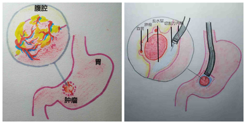 内镜手术由刘锐主治医生主刀。患者胃部瘤体位于胃角,位置不佳,令手术非常棘手,但凭借娴熟技术,刘锐医生成功在胃壁建立隧道并探查瘤体,确定瘤体位于胃壁固有肌层,遂决定在隧道内进行肿瘤切除。这样能够在切除瘤体的同时,保证胃壁的完整,创伤小,恢复快。在打开固有肌层暴露瘤体后,手术团队倒吸一口凉气,发现瘤体源于胃壁,但基本向胃腔外生长,并与网膜紧密粘连,包绕许多粗大血管。如果损伤血管会立即导致内镜难以控制的腹腔内出血,而患者为“熊猫血”,能供输注的血液十分稀缺,一旦出血将会危及生命。刘锐主治医生沉着应对,运用娴熟的内镜技术,在血管、网膜与瘤体之间进行分离,如同庖丁解牛一般将瘤体从网膜中游离,最终成功将瘤体从胃壁完整切除,整个手术过程出血量几乎为0。切除瘤体后经过胃腔内缝合,腹部没有任何切口,实现了内镜超微创治疗。