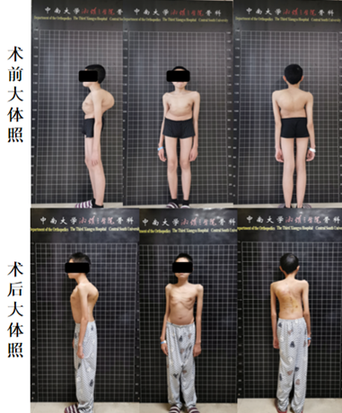 经过多学科会诊和脊柱外科全体专家讨论后,团队制定了详尽而周密的治疗计划。首先利用患儿的脊柱3D打印模型进行手术模拟,确定了截骨范围及复位方案,最终选择了截骨范围为T10-T12,并利用人工椎体做支撑,在牵引下复位脊柱。确定手术方案后,3月10日,由邓幼文教授、周勇副教授,王正光主治医师、刘仁峰总住院医师组成的手术医师团队,为小袁实施了后入路脊柱后凸畸形矫形手术。术后生命体征平稳,脊柱序列恢复较满意,身高增高了近10公分。目前小袁,已顺利出院。