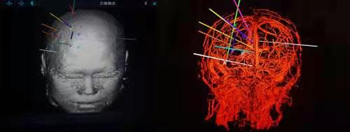 图2 3D术前重建 术前计划,确定如何将电极置入靶点而不损伤重要神经和血管