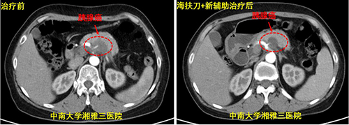 2021年11月9日,在主任余枭的指导下,陈浪博士在湘雅三医院海扶中心为该患者进行了针对胰腺病灶的海扶刀手术。海扶术后第一天,该患者的疼痛症状便基本消失,不再需要服用止痛药,生活质量较前明显改善,联合应用第一次化疗后满意出院。出院后患者于我院规律复查并定期接受新辅助治疗。复查CT显示该患者的胰腺低密度灶范围较前缩小,大部分坏死可能,血管受累情况较前明显改善。