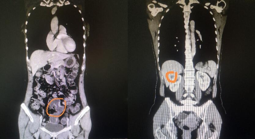 CT图像(左图是乙状结肠病灶 右图示右肝转移病灶)