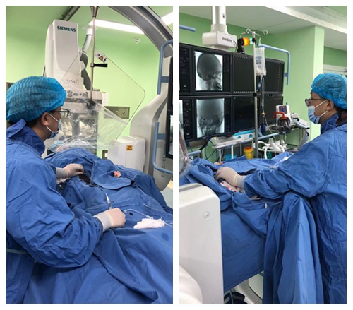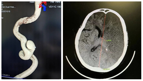 任何一点处理不当,都可能导致患者死亡。最终团队经过综合研判决定首先以最快速度为患者行去骨瓣减压术保住性命。术后入神经外科重症监护病房,通过医护精心治疗于3月28日转入普通病房。接下来团队面对患者复杂病情冲破一道道难关,于5月6日在全麻插管下为患者行“左侧颈内动脉载瘤血管内血流导向支架置入术+弹簧圈动脉瘤栓塞术”。面对复杂扭曲的血管,仅仅耗时2小时就成功完成了手术。