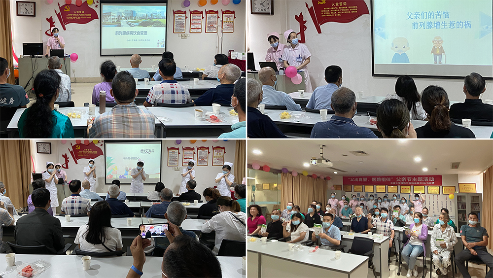 6月18日周六下午,泌尿外科28病区护士长徐龙携护理团队在外科楼15楼示教室为病友及家属们举办“父出真爱,医路相伴”的主题病友陪人会。良性前列腺增生症(BPH)是引起中老年男性排尿障碍最常见的一种良性疾病。如果不积极治疗则会带来泌尿系感染或结石,出现尿频、尿急和尿痛,堵塞程度逐渐加重可引发肾功能不全、肾积水等。活动中,罗惠方主管护师为各位病友解读“父亲们的烦恼——前列腺增生惹的祸”;刘丹主管护师讲解了“前列腺疾病的饮食管理”;刚下临床的南华大学船山学院护理实习生们一起为大家带来手势舞“感恩的心”,并着重讲解洗手的重要性和正确的洗手方法。病友和家属们们纷纷表示在此次活动中受益匪浅。