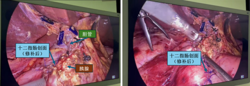 经过审慎讨论,与会多学科专家一致意见:患者具有手术指征,优先考虑行十二指肠降段肿块局部切除术,但难度极大,一旦损伤胆、胰管,可能出现危及生命的严重并发症及后果,行十二指肠降段部分切除联合毕II式胃空肠吻合术可能性最大,不排除胰十二指肠切除术可能。面对年轻、鲜活的生命和如炸弹般位置棘手、风险极高的肿瘤病变,孙吉春教授医疗组不畏压力与艰难,积极完善术前准备。在患者出血好转、身体情况逐步恢复的情况下,相关三个科室与患者本人及家属积极沟通,在肝胆胰二病区余枭主任支持下,于11月25日为患者开展内镜联合腹腔镜下十二指肠肿瘤局部切除术。历经4小时,孙教授团队切除部分胰腺,成功实现了病变的完整切除,同期切除胆囊(胆囊多发结石),未损伤胆管和胰管等重要结构。对十二指肠残壁进行精细修补后,王晓艳教授、肖志明教授为患者行胃镜下胃空肠三腔营养管置入,为患者术后恢复及减少并发症风险保驾护航。术中快速病理提示梭形细胞瘤,与MDT团队术前间质瘤的判断亦相吻合。