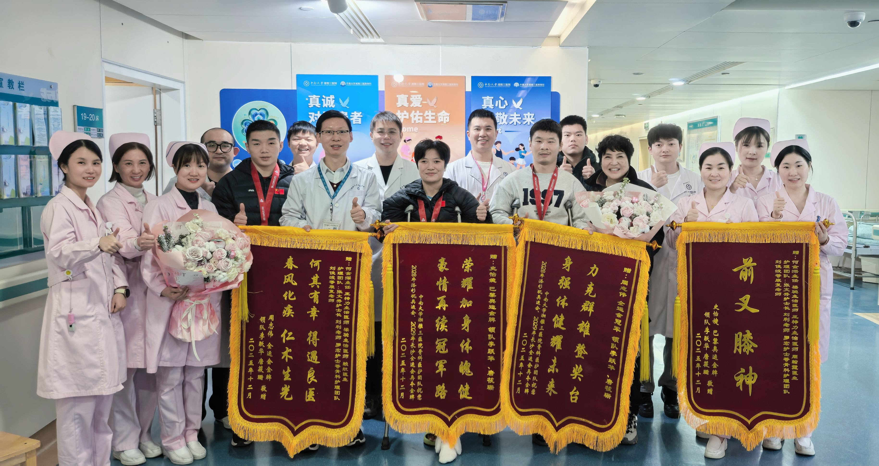 史怡婕、周志伟及教练团队与湘雅三医院运动医学团队合影