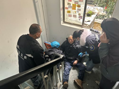 “大家配合好,一、二、三,起!”在狭窄的楼道里,肖艺梅和刘述来弯下腰,用手臂和肩膀架起老人的身体,王建志则在后方托举。由于空间有限,他们只能侧着身子,半蹲着,一级一级缓慢下行。尽管体力透支,但三人咬紧牙关,小心翼翼地保持老人体位平稳。
