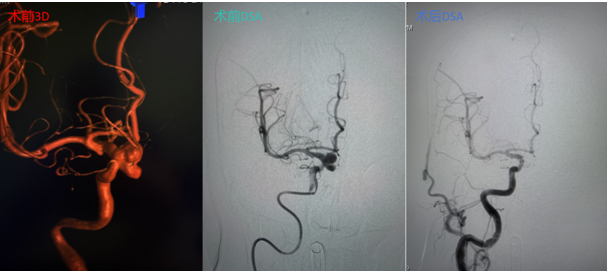 术后即刻造影显示,动脉瘤腔内血流消失,载瘤动脉通畅无阻,手术取得圆满成功,患者已康复出院。