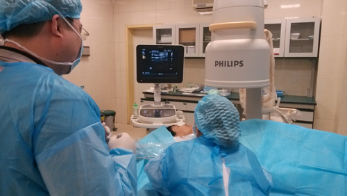 植入式静脉输液港又称植入式中央静脉导管系统(CVPAS),简称输液港,经手臂静脉植入式静脉输液港是将输液港座埋置在手臂皮下的导管系统,该技术为国内近两年发展的静脉输液最新技术,在湖南省属我院率先开展。该植入方法较目前常用的胸壁植入式输液港具有创伤小,操作难度低,输液港座位置隐秘等优点,尤其对于需要接受胸部治疗的患者增加了安全性。邓琛护士长在超声引导下运用塞丁格穿刺技术为患者经手臂穿刺置管,随之王征医生将输液港座妥善固定在手臂皮下,最终在现场C臂的准确定位下顺利完成置管,并立即可以进行静脉输液。整个过程出血少,耗时短,操作顺利,患者无痛苦并对操作非常满意。