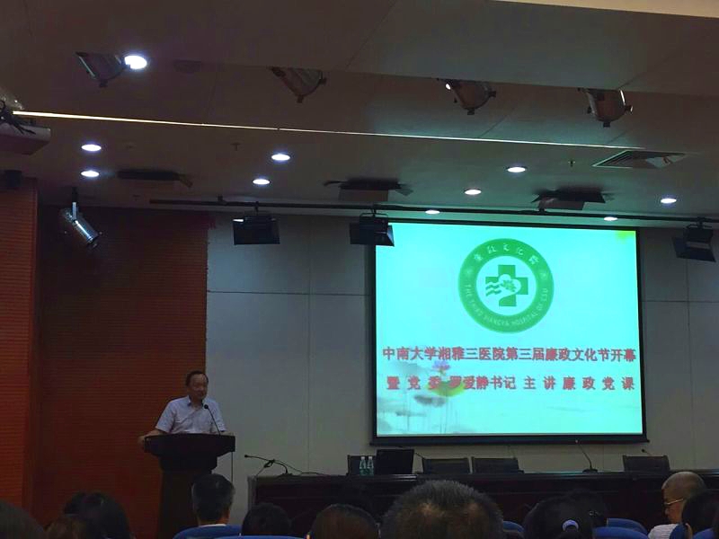 10月14日晚上,湘雅三医院第三届廉政文化节启动仪式在外科楼二楼举行,院领导罗爱静、陈方平、吴希林、朱晒红、邓云龙、杨飞龙和医院部分历任院领导以及各党支部参加了启动仪式,并认真聆听党委书记罗爱静主讲廉政党课《践行“三严”须过好廉洁关》。