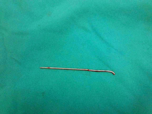 患者入院后经过胸外科和骨科的讨论,胸外科利用胸腔镜顺利从嗲嗲肺里取出一根11厘米长的克氏针,术中出血量很少。