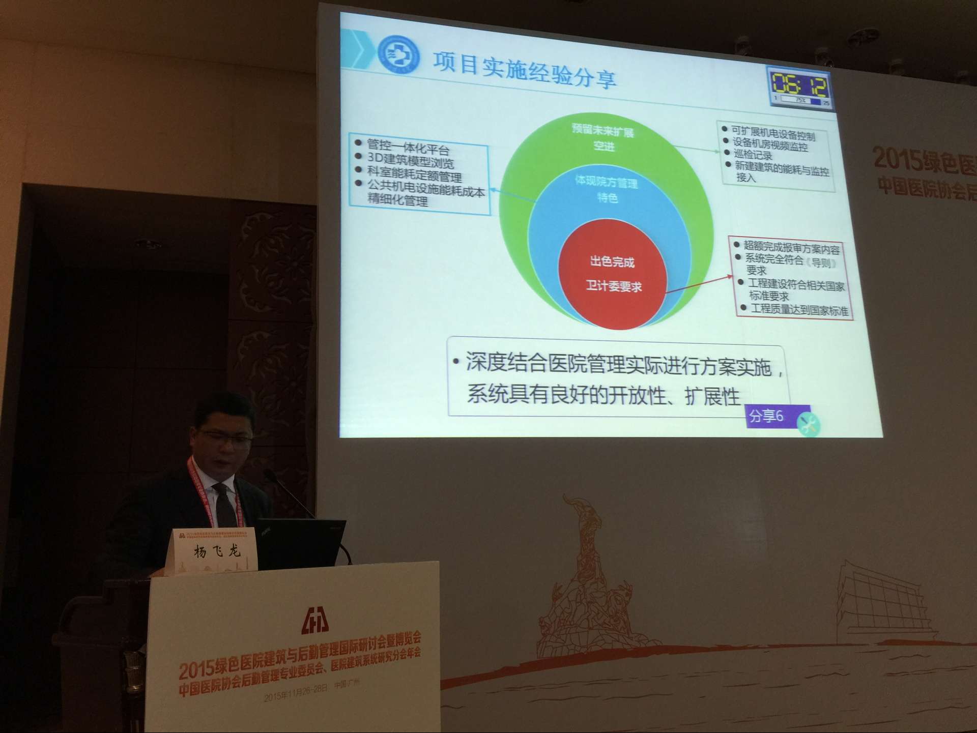 11月26日—28日,由中国医院协会主办的2015年绿色医院建筑与后勤管理国际研讨会暨博览会在广州白云国际会议中心举行。来自全国各地的近1000位医院后勤管理专家、分会会员及有关代表参加。医院副院长、中国研究型医院协会后勤分会副会长、湖南省医院协会后勤专业委员会副主委杨飞龙,受邀在“后勤智能化平台与节能减排”专场作了《医院能耗监测平台建设》的专题报告,向全国同行和与会专家介绍我院的有关经验,杨飞龙副院长是湖南省唯一在此次大会上做演讲的嘉宾。