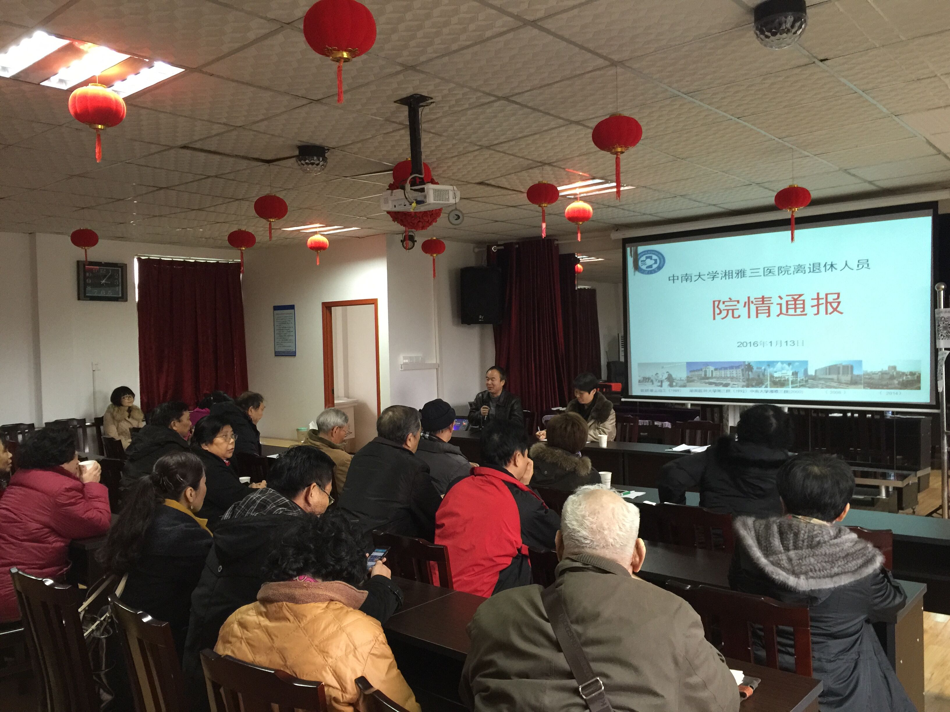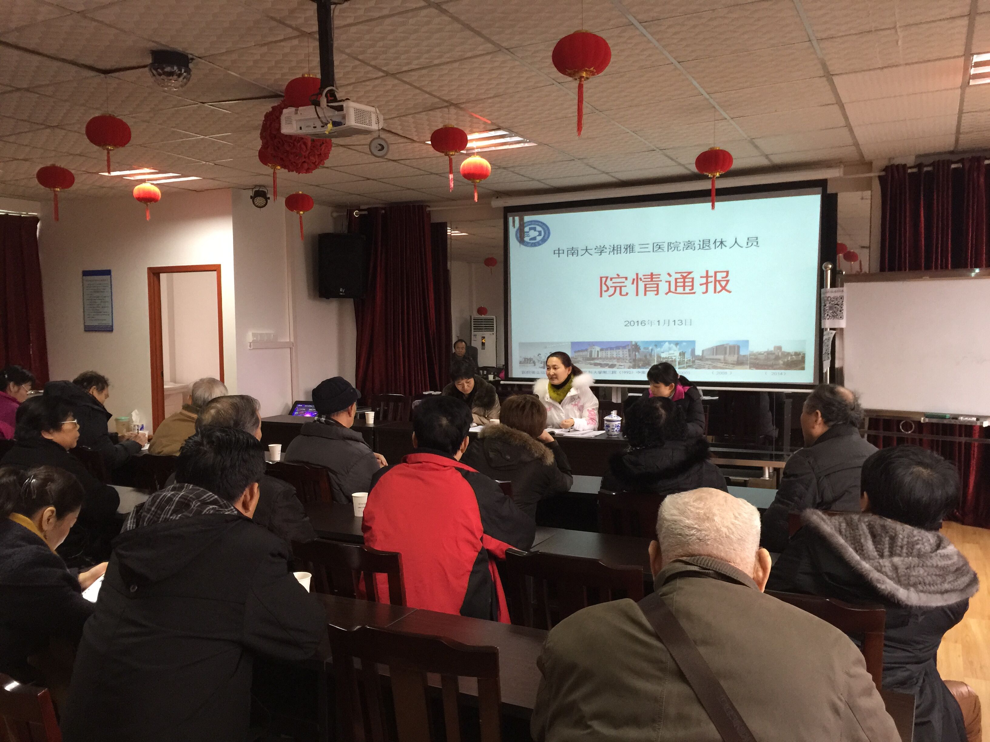 1月13日下午,离退休多功能活动室,邓云龙副书记带领离退休部门工作人员,在离退休党支部专题组织生活会前,为全体离退休党员介绍国家医改政策、医院重大管理举措、最新医疗技术、医疗项目等。史毓阶、李在东、刘浔阳、郑兰香、周昌菊等40多名离退休党员参加了会议。